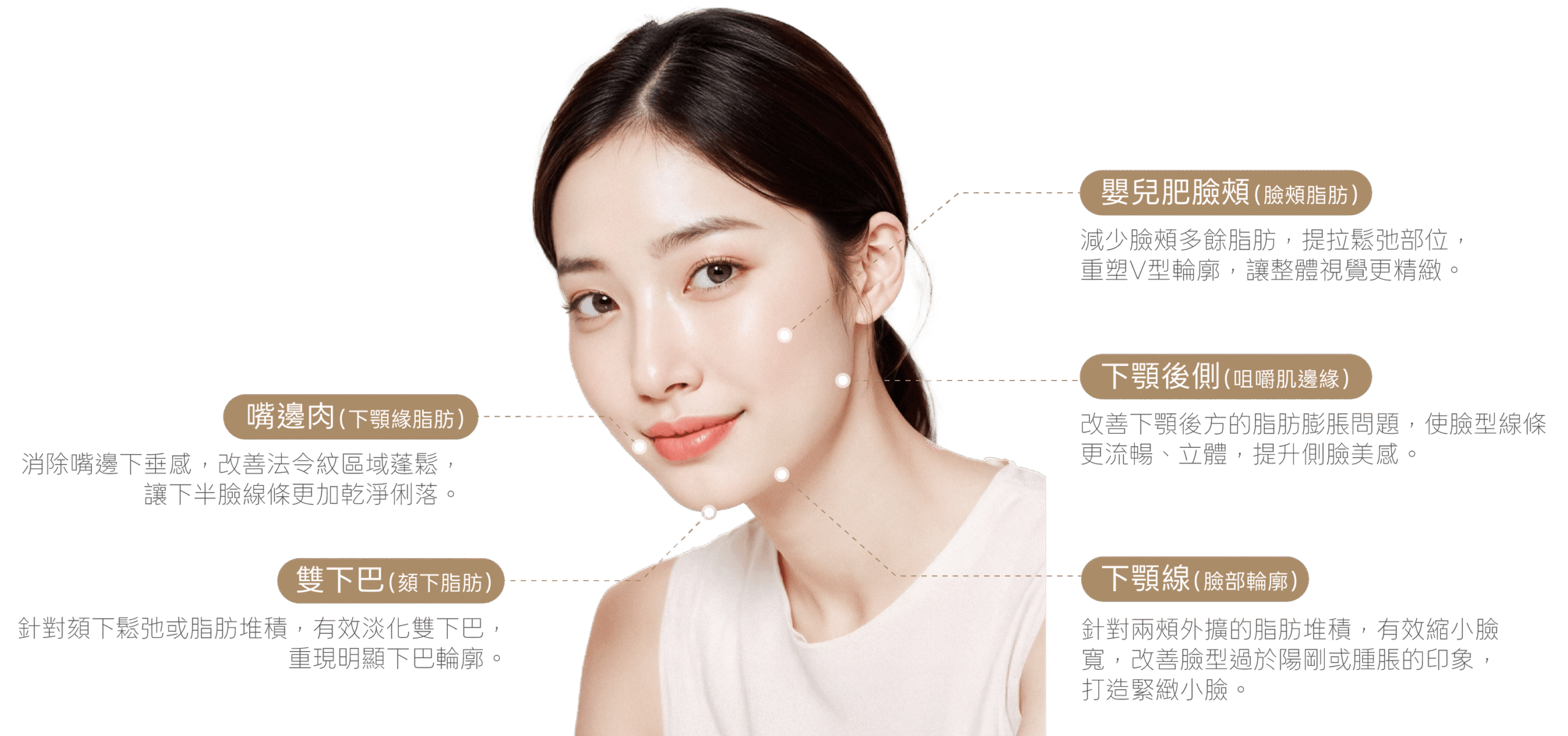 GPC Contour Injection GPC輪廓注射 溫和代謝多餘脂肪與水腫,勾勒俐落清爽的小臉輪廓。 About the Treatment 什麼是GPC輪廓注射? GPC 輪廓注射是一種非手術式、低負擔的精緻臉部塑形療程,透過促進血液與淋巴循環,幫助代謝局部堆積的脂肪與體內廢物,溫和地減少臉部脂肪與水腫,使臉型更加小巧、線條更俐落。相較於傳統的脂肪抽吸或削骨手術,GPC 注射無需麻醉、無傷口、不需恢復期,僅約 10 分鐘即可完成療程,讓你輕鬆實現「微整級小臉」效果。 Treatment Features GPC輪廓注射的特色 這項療程特別適合希望改善臉部浮腫、嬰兒肥、雙下巴、腮幫子明顯等困擾的人,療程後即可正常生活、當天可化妝、上班上課不影響,是現代忙碌生活中快速變美的最佳選擇。 促進代謝、加速輪廓緊緻 透過活化淋巴與血液循環,有效代謝多餘水分與脂肪,淡化浮腫。 溫和瘦臉、不含類固醇 採用天然植物萃取成分,避免肌膚萎縮、凹陷等副作用,安全性高。 改善嬰兒肥與下顎線鬆弛 針對臉頰肉、雙下巴、嘴邊肉等脂肪囤積部位,收緊線條,打造V臉輪廓。 療程快速、幾乎無恢復期 施打時間僅約10分鐘,無需麻醉、無傷口,術後可立即上妝。 自然漸進、效果可控 GPC效果溫和、漸進式雕塑,能依需求調整施作次數與區域。 (不像抽脂或侵入式手術般一次改變過大) Treatment Areas 適用施作部位 玻尿酸填充可針對鼻部、淚溝、唇部、法令紋、額頭、下巴、眉間及蘋果肌等多個臉部關鍵區域進行客製化調整,透過細緻填補與比例修飾,改善凹陷、陰影與細紋問題,同時強化五官立體感,讓整體輪廓更顯平衡、柔和且自然。 下顎線(臉部輪廓) 針對兩頰外擴的脂肪堆積,有效縮小臉寬,改善臉型過於陽剛或腫脹的印象,打造緊緻小臉。 嬰兒肥臉頰(臉頰脂肪) 減少臉頰多餘脂肪,提拉鬆弛部位,重塑 V 型輪廓,讓整體視覺更精緻。 嘴邊肉(下顎緣脂肪) 消除嘴邊下垂感,改善法令紋區域蓬鬆,讓下半臉線條更加乾淨俐落。 雙下巴(頦下脂肪) 針對頦下鬆弛或脂肪堆積,有效淡化雙下巴,重現明顯下巴輪廓。 下顎後側(咀嚼肌邊緣) 改善下顎後方的脂肪膨脹問題,使臉型線條更流暢、立體,提升側臉美感。 Treatment Process GPC輪廓注射施作流程 STEP 01 3D 皮膚與臉部輪廓檢測 使用 3D META VU 儀器進行 360 度全臉掃描,精準分析膚質、輪廓結構與老化狀況,作為後續評估依據。 STEP 02 院長一對一諮詢 根據臉部比例與個人需求,確認適合的填充區域與劑量。 STEP 03 精準注射 使用細針將 GPC 注射液導入指定部位,療程時間短,幾乎無恢復期。 STEP 04 術後說明與保養建議 說明術後反應與注意事項,並提供後續保養建議,讓效果更持久自然。 Who Is It For? 推薦施作對象 • 因臉部贅肉導致輪廓線條不明顯者• 希望針對局部部位進行脂肪代謝者• 雙下巴明顯、脖子線條不清晰者• 因老化導致鬆弛下垂、脂肪堆積者• 害怕手術、尋求非侵入式瘦臉方案者 Aftercare Guidelines 術後注意事項 1. 術後 2~3 小時內請避免洗臉與上妝,讓肌膚有時間穩定恢復。 2. 因施打處可能使用鈍針,少數人會出現輕微瘀青,約數日內會自然消退。 3. 女性若於排卵期或經期前後注射,可能會短暫影響生理週期屬正常現象。 4. 部分人可能出現頭暈、疲倦、輕微過敏等症狀,如持續時間較長請諮詢醫師。 5. 局部紅腫、皮膚緊繃或搔癢為暫時現象,多數人在術後一至數日內即恢復。 6. 術後可進行輕度活動,促進代謝與恢復,但避免劇烈運動與過度按摩注射部位。 Possible Side Effects & Risks 副作用與風險提醒 所有療程皆因個人體質與狀況不同,可能導致效果出現差異,也有極少數機率出現副作用。建議您在療程施作前,務必與醫師進行充分且詳盡的諮詢,確認自身狀況是否適合施作,並審慎評估後再決定是否接受療程。