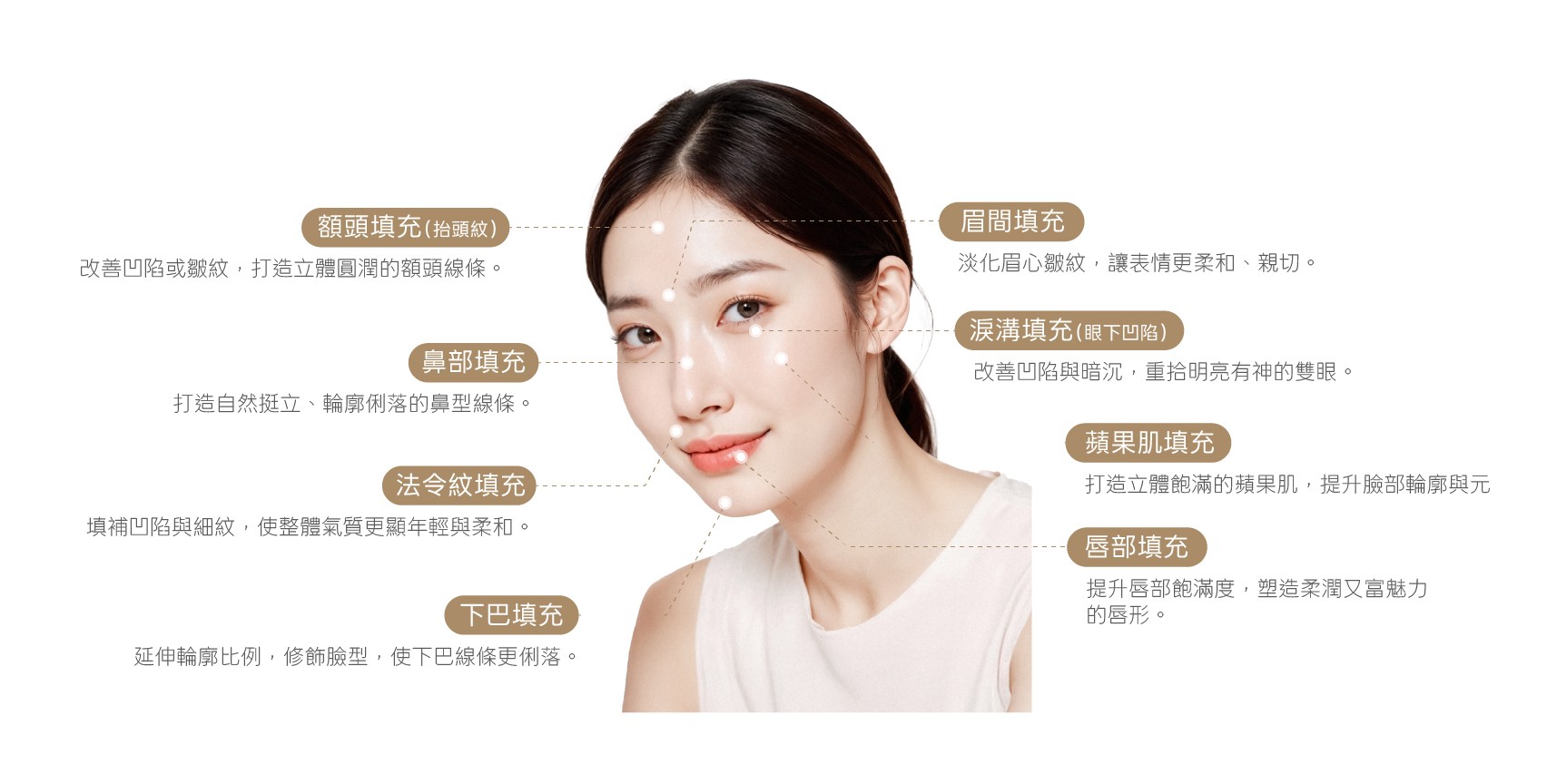 Hyaluronic Acid Filler 玻尿酸填充 細緻修飾凹陷線條,打造自然柔和的立體美感。 About the Treatment 什麼是玻尿酸填充? 玻尿酸填充是一種非手術式、微創注射療程,利用高親水性的透明質酸,精準補充因老化或體質而流失的肌膚容量,改善凹陷、紋路與陰影,使五官更加立體,輪廓線條更顯柔和自然。 Treatment Features 玻尿酸填充的特色 根據每個人不同的臉型結構與需求,療程可客製化調整注射位置與劑量,從細緻修飾鼻型、下巴線條,到柔化法令紋、填補淚溝,打造兼具比例與質感的個人化輪廓美學。治療過程迅速、安全,幾乎無恢復期,效果自然不僵硬,是現代人首選的輕醫美療程。 填補凹陷、修飾陰影 有效改善法令紋、淚溝、夫妻宮等凹陷部位,讓輪廓更顯平滑緊緻。 立體雕塑、自然柔和 精準打造鼻型、下巴與輪廓線條,提升整體五官立體度,自然不生硬。 撫平細紋、提升膚質感 改善細小皺紋與鬆弛感,肌膚看起來更光滑細緻、有彈性。 療程迅速、無需修復期 採用微創注射技術,當日即可上妝,幾乎不影響日常生活。 高客製化、效果可調整 可依不同部位、膚況與個人需求調整注射劑量與深度,打造專屬美感比例。 Treatment Areas 適用施作部位 玻尿酸填充可針對鼻部、淚溝、唇部、法令紋、額頭、下巴、眉間及蘋果肌等多個臉部關鍵區域進行客製化調整,透過細緻填補與比例修飾,改善凹陷、陰影與細紋問題,同時強化五官立體感,讓整體輪廓更顯平衡、柔和且自然。 鼻部填充 打造自然挺立、輪廓俐落的鼻型線條。 淚溝填充(眼下凹陷) 打造自然挺立、輪廓俐落的鼻型線條。 唇部填充 提升唇部飽滿度,塑造柔潤又富魅力的唇形。 法令紋填充 填補凹陷與細紋,使整體氣質更顯年輕與柔和。 抬頭紋填充 填補凹陷與細紋,使整體氣質更顯年輕與柔和。 下巴填充 延伸輪廓比例,修飾臉型,使下巴線條更俐落。 眉間填充 淡化眉心皺紋,讓表情更柔和、親切。 蘋果肌填充 打造立體飽滿的蘋果肌,提升臉部輪廓與元氣感。 Treatment Process 玻尿酸施作流程 STEP 01 3D 皮膚與臉部輪廓檢測 使用 3D META VU 儀器進行 360 度全臉掃描,精準分析膚質、輪廓結構與老化狀況,作為後續評估依據。 STEP 02 院長一對一諮詢 根據臉部比例與個人需求,確認適合的填充區域與劑量。 STEP 03 精準注射填充 由醫師親自操作,針對所需部位進行精準注射,打造自然飽滿的立體線條。 STEP 04 清潔與表面麻醉 臉部清潔後塗抹表面麻醉膏,減少不適感。 (如有需要可施打局部麻醉) Who Is It For? 推薦施作對象 • 對臉部凹陷、缺乏立體感感到困擾者• 希望臉型更精緻、更有精神者• 法令紋、木偶紋等老化皺紋明顯者• 想要快速改善局部凹陷,但又不想動手術者• 即將拍攝畢業照、證件照或婚紗照者 Aftercare Guidelines 術後注意事項 1. 當日請避免洗臉時使用刺激性清潔品或讓施作部位接觸水分。 2. 脫落的敷貼膠(人工皮)請於療程結束數小時後輕柔取下。 3. 填充劑非固定性物質,初期若受到擠壓、推拉等外力,可能影響形狀與均勻度。 4. 腫脹、微紅、瘀青等多屬自然反應,通常數日內會自行緩解;若出現劇烈不適,請立即聯繫診所。 5. 根據個人肌膚狀況與施作區域,使用產品的持久度會有所差異。 6. 請遵照醫囑服用抗發炎藥物,以避免感染與其他併發症。 Possible Side Effects & Risks 副作用與風險提醒 所有療程皆因個人體質與狀況不同,可能導致效果出現差異,也有極少數機率出現副作用。建議您在療程施作前,務必與醫師進行充分且詳盡的諮詢,確認自身狀況是否適合施作,並審慎評估後再決定是否接受療程。