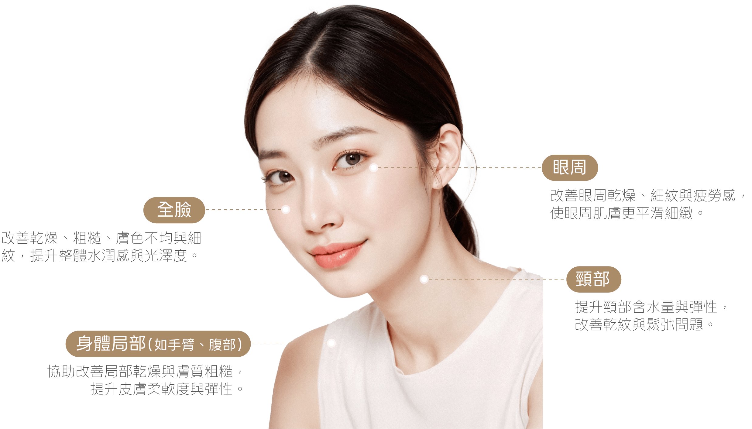 Insonic Micro Dynamic Massage INSonic 超音波保濕導入 多頻超音波直達肌底,一次完成補水、修復、彈力的深層保濕導入療程。 About the Treatment 什麼是 INSonic 超音波保濕導入? INSonic 是一款以 1MHz、3MHz、10MHz 多頻超音波為核心的水光導入療程,透過不同頻率的超音波能量,將能量穩定傳遞至皮膚各層次,提升皮膚含水量、促進細胞活化,並刺激膠原蛋白與彈力蛋白生成。 Treatment Features INSonic 超音波保濕導入的特色 此療程又被稱為「水光音波」或「超音波保濕導入」,可改善乾燥、粗糙、毛孔、泛紅、痘疤與細紋等問題,並可與雷射、皮秒、煥膚療程併行,作為術後修復與加乘管理療程。 多頻超音波能量(1/3/10MHz) 依不同頻率將能量導入皮膚不同深度,1MHz 可傳遞至真皮深層,3MHz 促進膠原生成,10MHz 作用於表皮層,達到分層補水與修復效果。 深層補水與皮膚含水量提升 超音波能量可均勻滲透至皮膚各層,提升水分滲透與儲存能力,改善乾燥、脫屑與粗糙感。 促進膠原蛋白與彈力蛋白生成 透過機械性刺激與熱效應,活化細胞代謝,促進膠原蛋白與彈力蛋白新生,提升肌膚彈性與緊實度。 抑制老化酵素、強化皮膚屏障 可降低 MMPs(分解膠原的酵素)活性,並促進 GAGs(保濕因子)生成,有助於延緩老化並提升皮膚保水能力。 多種專用探頭 依眼周、臉部與身體部位選擇不同探頭與頻率,能量輸出更精準,施作範圍更彈性。 非侵入式療程,幾乎無恢復期 全程無傷口,術後僅可能出現短暫泛紅、溫熱感或乾燥,多數人可立即恢復日常作息。 Treatment Areas 適用施作部位 INSonic 可依不同區域選擇對應頻率與探頭進行分區施作,將超音波能量穩定導入目標層次,提升皮膚含水量、修復屏障並促進膠原新生。療程可客製調整施作範圍,強調整體膚況改善與比例協調,使補水、亮膚與彈力提升效果更自然。 全臉 改善乾燥、粗糙、膚色不均與細紋,提升整體水潤感與光澤度。 眼周 改善眼周乾燥、細紋與疲勞感,使眼周肌膚更平滑細緻。 頸部 提升頸部含水量與彈性,改善乾紋與鬆弛問題。 身體局部(如手臂、腹部) 協助改善局部乾燥與膚質粗糙,提升皮膚柔軟度與彈性。 Treatment Process INSonic 超音波保濕導入施作流程 STEP 01 3D 皮膚與臉部輪廓檢測 使用 3D META VU 儀器進行 360 度全臉掃描,精準分析膚質、輪廓結構與老化狀況,作為後續評估依據。 STEP 02 院長一對一諮詢 透過一對一專業諮詢,全面評估個人肌膚狀況,量身規劃療程範圍。 STEP 03 清潔並進行施作 進行清潔,搭配保濕或修復精華,依部位選擇探頭與1、3、10MHz 頻率,將超音波能量均勻導入皮膚。 STEP 04 術後照護說明 施作完成後說明術後照護重點與注意事項,協助修復期順利進行。 Who Is It For? 推薦施作對象 • 皮膚乾燥、缺水、粗糙者• 毛孔明顯、膚質不細緻者• 想提升肌膚光澤與彈性者• 有泛紅、敏感或修復需求者• 雷射或煥膚術後需加強修復者• 希望改善初老細紋與膚況穩定度者 Aftercare Guidelines 術後注意事項 1. 術後可能出現短暫泛紅、溫熱感或輕微乾燥,通常可自行緩解。 2. 當天可洗臉與上妝,但請避免用力摩擦或刺激肌膚。 3. 建議加強保濕,使用溫和型保濕產品穩定膚況。 4. 一週內避免高溫環境(如烤箱、蒸氣室、熱瑜珈)。 5. 外出請務必做好防曬,避免紫外線刺激影響修復效果。 Possible Side Effects & Risks 副作用與風險提醒 所有療程皆因個人體質與狀況不同,可能導致效果出現差異,也有極少數機率出現副作用。建議您在療程施作前,務必與醫師進行充分且詳盡的諮詢,確認自身狀況是否適合施作,並審慎評估後再決定是否接受療程。