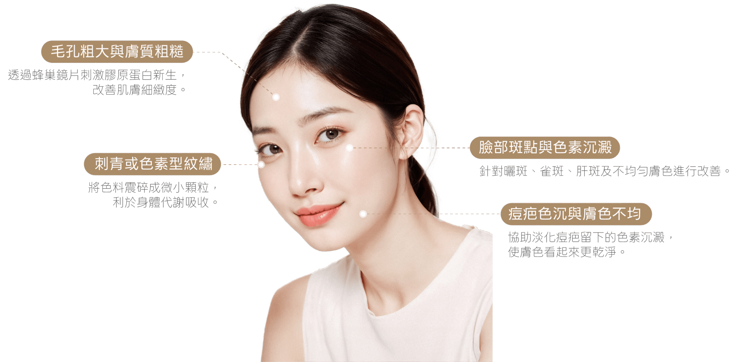 相較傳統奈秒雷射,PicoSure Pro 能將色素震碎得更細小,使其更容易被身體代謝吸收,同時啟動皮膚的修復機制,促進膠原蛋白與彈力纖維新生,達到改善色斑、均勻膚色與提升膚質細緻度的效果。