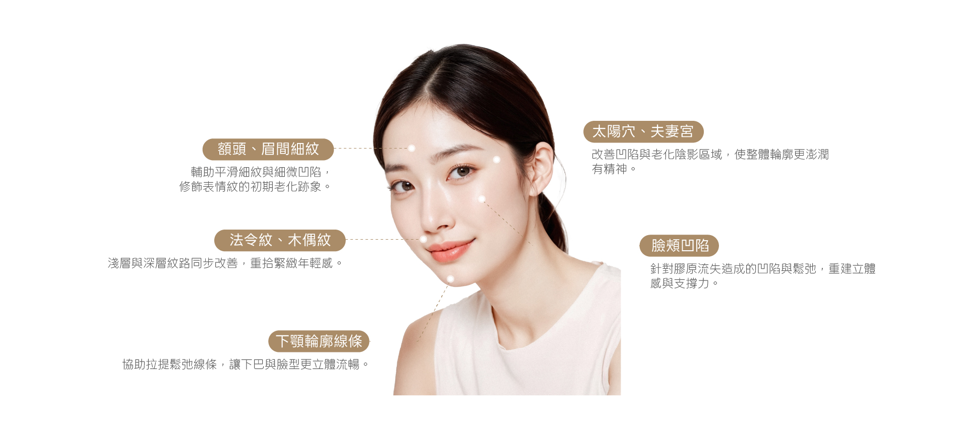 Sculptra PLLA Sculptra 舒顏萃 循序啟動膠原新生,養成自然緊實的立體輪廓。 About the Treatment 什麼是 Sculptra 舒顏萃 Sculptura(舒顏萃)是一款以聚左旋乳酸(PLLA)為基礎的膠原蛋白增生注射劑,最早於 1999 年在美國上市,並通過美國 FDA、歐盟 CE 及韓國食藥處等多國認證,為高安全性的醫療級注射產品。Sculptra 舒顏萃屬於漸進式膠原蛋白增生療程,效果並非一次完成。一般建議依個人膚況與老化程度,規劃 2–3 次療程,每次施作間隔約 4–6 週,讓膠原蛋白逐步生成並穩定堆疊,效果呈現更加自然、持久。 Treatment Features Sculptra 舒顏萃的特色 不同於玻尿酸等立即填充型針劑,Sculptura 舒顏萃透過長效刺激自體膠原蛋白再生,逐步改善皮膚鬆弛、凹陷與彈性流失問題,達到漸進式的輪廓緊實與澎潤效果。療程效果自然不突兀,通常於 6 週後開始明顯呈現,效果可維持長達兩年以上。 促進自體膠原蛋白新生 注射後會啟動膠原蛋白生成機制,有效重建皮膚結構,強化真皮層彈性與厚度。 效果自然、漸進顯現 無突兀腫脹感,膠原增生過程為漸進式,臉部線條自然柔和不僵硬。 長效維持、支撐力佳 一次療程效果可持續兩年以上,穩定改善老化凹陷與輪廓鬆弛。 高安全性,通過多國認證 美國 FDA、歐盟 CE、韓國 MFDS 等多項國際醫療認證,使用安心可靠。 無須手術、修復期短 為非手術式注射療程,日常生活幾乎不受影響,適合忙碌族群微整保養。 Treatment Areas 適用施作部位 Sculptra 舒顏萃適用於太陽穴、夫妻宮、臉頰凹陷、法令紋與木偶紋、下顎輪廓線條,以及額頭與眉間等因膠原流失而出現凹陷或鬆弛的臉部區域。透過漸進式刺激自體膠原蛋白新生,逐步重建肌膚結構與支撐力,改善老化陰影與線條下垂問題,使輪廓線條更加飽滿、緊實且自然,適合追求長效、低調且不突兀年輕感的人。 太陽穴、夫妻宮 改善凹陷與老化陰影區域,使整體輪廓更澎潤有精神。 法令紋、木偶紋 淺層與深層紋路同步改善,重拾緊緻年輕感。 臉頰凹陷 針對膠原流失造成的凹陷與鬆弛,重建立體感與支撐力。 下顎輪廓線條 協助拉提鬆弛線條,讓下巴與臉型更立體流暢。 額頭、眉間細紋 輔助平滑細紋與細微凹陷,修飾表情紋的初期老化跡象。 Treatment Process Sculptra 舒顏萃施作流程 STEP 01 3D 皮膚與臉部輪廓檢測 使用 3D META VU 儀器進行 360 度全臉掃描,精準分析膚質、輪廓結構與老化狀況,作為後續評估依據。 STEP 02 院長一對一諮詢 透過 1 對 1 客製化諮詢,了解個人膚況與主要在意問題,量身規劃治療部位。 STEP 03 精準注射 敷上表層麻醉霜,提升施作舒適度,根據部位精準注射,深層活化膠原蛋白,重塑輪廓。 STEP 04 術後照護說明 療程結束後,由護理師協助按摩注射部位,並提供居家保養與注意事項說明。 Who Is It For? 推薦施作對象 • 嘴邊肉、法令紋明顯,臉部線條鬆垮下垂者• 顴骨、蘋果肌、淚溝凹陷,導致氣色黯淡無神者• 想填補臉頰、夫妻宮、太陽穴等凹陷部位者• 希望改善皮膚彈性,緊實老化肌膚者• 追求自然、漸進式變美,期待長效抗老成果者 Aftercare Guidelines 術後注意事項 1. 施作後局部可能出現短暫紅腫、瘀青、硬塊或結節等情況,多屬暫時反應,會隨時間逐漸改善。 2. 局部若有瘀青屬正常現象,多數可於數日內自行消退。 3. 為促進膠原蛋白均勻增生,建議連續 5 天、每天 5 次、每次 5 分鐘,輕柔按摩注射部位。 4. 術後一週內避免泡湯、桑拿、劇烈運動及飲酒,以免影響修復。 5. 請避免讓注射部位接觸不潔或高感染風險環境,以降低感染機率。 Possible Side Effects & Risks 副作用與風險提醒 所有療程皆因個人體質與狀況不同,可能導致效果出現差異,也有極少數機率出現副作用。建議您在療程施作前,務必與醫師進行充分且詳盡的諮詢,確認自身狀況是否適合施作,並審慎評估後再決定是否接受療程。