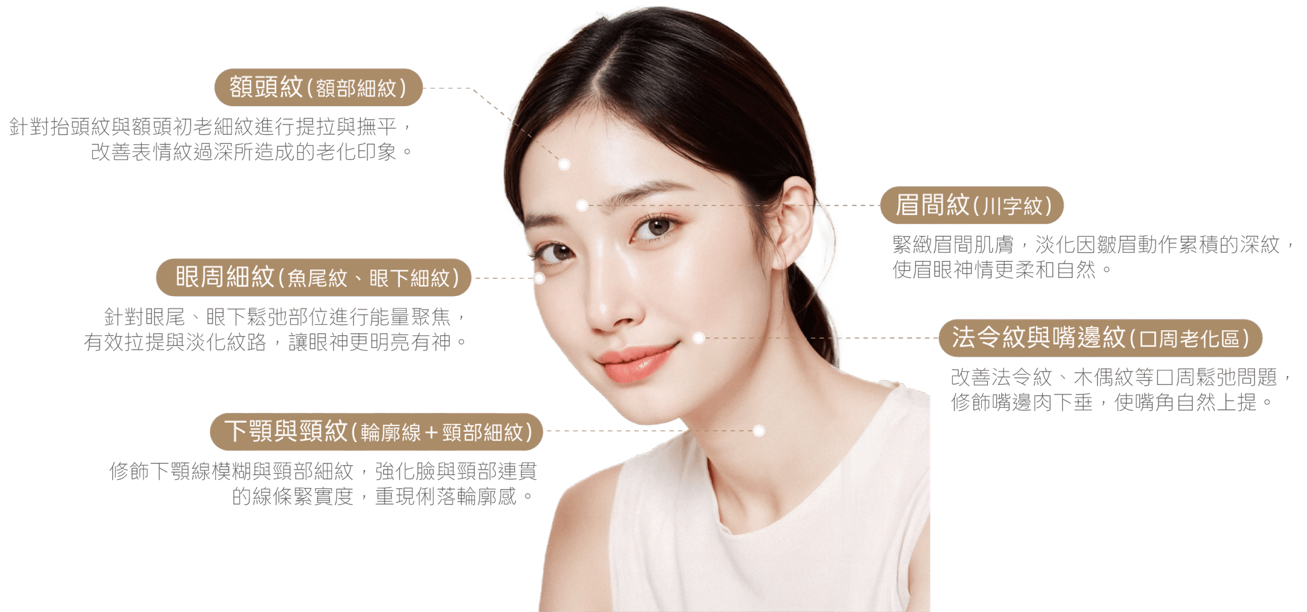 Shurink Universe HIFU Shurink Universe海芙音波 超音波拉提緊緻輪廓,深層喚醒肌膚彈性 About the Treatment 什麼是 Shurink Universe 海芙音波? Shurink Universe 是新一代雙模式超音波拉提海芙療程,為經典 Shurink 技術的全面升級版。透過點狀(Dot)與線狀(MP)兩種能量輸出模式,深入不同肌膚層次,有效活化膠原蛋白新生,達成 立體拉提 × 緊緻輪廓 × 膚質優化 的三重美肌功效。 Treatment Features Shurink Universe 海芙音波的特色 Shurink Universe 最大特色為搭配多種深度探頭,並整合專屬導入精華《Aurora Ampoule》,進一步提升肌膚亮澤度與緊實效果。療程過程舒適、時間僅約 30 分鐘,術後可立即上妝、恢復日常,是忙碌生活中追求高效保養的理想選擇。 Dot×MP雙模式拉提技術 結合點狀能量深層緊實筋膜層與線性能量平滑肌膚表層,內外同步強化支撐力與撫紋效果,一次療程兼顧深淺層拉提需求。 升級探頭系統,對應不同肌膚層次 Ultra F 多種深度探頭(1.5 / 2.0 / 3.0 / 4.5mm)精準作用各層肌膚,涵蓋從表皮到筋膜層。Ultra Booster 則優化凹陷部位能量密合度,專攻嘴角、下巴等細節區域。 速度提升2.5倍,快速完成療程 新一代 MP 模式提升輸出效率,大幅縮短施作時間,在更短時間內達成理想拉提與緊緻效果。 Aurora安瓶導入修護肌膚 專用安瓶含38種營養成分,深層導入,同步補水亮白,改善乾燥暗沉與初老膚況,效果更持久自然。 非侵入式設計,零恢復期 無針、無傷口、無需修復期,術後僅有輕微熱感或緊繃感,當天可上妝上班,療效穩定、舒適度高 Treatment Areas 適用施作部位 Shurink Universe 海芙音波針對多處精細臉部區域,透過客製化能量深度設定,有效緊緻肌膚、撫平紋路,從額頭到頸部都能細膩調整,打造自然不過度的拉提效果。特別適合希望改善鬆弛、細紋與輪廓模糊問題的族群,療程著重於分區處理與均衡提拉,維持面部整體的柔和比例。 額頭紋(額部細紋) 針對初老細紋進行提拉與撫平,改善表情紋過深所造成的老化印象。 眉間紋(川字紋) 緊緻眉間肌膚,淡化因皺眉動作累積的深紋,使眉眼神情更柔和自然。 眼周細紋(魚尾紋、眼下細紋) 針對眼尾、眼下鬆弛部位進行能量聚焦,有效拉提與淡化紋路,讓眼神更明亮有神。 法令紋與嘴邊紋(口周老化區) 改善法令紋、木偶紋等口周鬆弛問題,修飾嘴邊肉下垂,使嘴角自然上提。 下顎與頸紋(輪廓線+頸部細紋) 修飾下顎線模糊與頸部細紋,強化臉與頸部連貫的線條緊實度,重現俐落輪廓感。 Treatment Process Shurink Universe 海芙音波施作流程 STEP 01 3D 皮膚與臉部輪廓檢測 使用 3D META VU 儀器進行 360 度全臉掃描,精準分析膚質、輪廓結構與老化狀況,作為後續評估依據。 STEP 02 院長一對一諮詢 透過一對一專業諮詢,全面評估個人肌膚狀況,量身規劃療程範圍。 STEP 03 麻醉並進行施作 塗抹適量表面麻膏,並依據不同部位與肌膚層次,選用對應深度的專利探頭進行治療。 STEP 04 術後說明與保養建議 施作完成後說明術後照護重點與注意事項,協助修復期順利進行。 Who Is It For? 推薦施作對象 • 想避免手術、尋求舒適非侵入式拉提者• 希望改善雙下巴、嘴邊肉與鬆弛感者• 臉型線條不清晰、渴望輪廓更立體者• 因年齡或表情累積而產生動靜態細紋者• 想提升膠原蛋白與彈性纖維生成者 Aftercare Guidelines 術後注意事項 1. 術後可立即洗臉與上妝,建議使用溫和型清潔產品。 2. 建議 3 日內以冷水洗臉,避免熱水干擾超音波熱效應的持續發揮。 3. 避免曝曬,外出請加強防曬與使用保濕修護產品,建議補充維他命 C 等抗氧化營養素。 4. 若施作部位出現異常不適(如過度紅腫、疼痛等),請盡速聯絡診所或返診。 5. 請勿過度按壓或搓揉治療部位,以免影響能量傳導效果與組織修復。 Possible Side Effects & Risks 副作用與風險提醒 所有療程皆因個人體質與狀況不同,可能導致效果出現差異,也有極少數機率出現副作用。建議您在療程施作前,務必與醫師進行充分且詳盡的諮詢,確認自身狀況是否適合施作,並審慎評估後再決定是否接受療程。