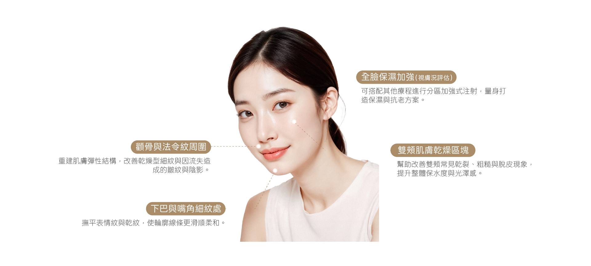SKINVIVE® by JUVÉDERM® SKINVIVE水光針 深層補水直達肌底,喚醒自然透亮的水潤光澤。 About the Treatment 什麼是 SKINVIVE 水光針? SkinVive 是由全球知名醫美品牌 Juvéderm 艾爾建 所研發,榮獲美國 FDA 認證的高濃度玻尿酸注射療程。最大特色在於:將擁有自體重量約 300〜1,000 倍水分吸附力的玻尿酸,直接注入真皮層,深層補水,改善乾燥粗糙、老化疲憊的膚況,讓肌膚即刻恢復「飽滿光澤感」。 Treatment Features SKINVIVE 水光針的特色 這款療程特別適合因歲月造成的肌膚鬆弛、暗沉或紋路明顯者,能在不影響五官輪廓的前提下,提升肌膚含水度與細膩度。SkinVive 注射後不改變臉型,也不會有塑膠感,很適合想要自然水嫩感的族群,是近年在韓國與歐美都相當熱門的「水光補水療程」。 深層補水、改善乾肌 將高濃度玻尿酸打進真皮層,補水效果比一般水光更深入,穩定膚況、改善乾燥脫皮。 打造水光肌、淡化細紋 在肌膚內形成保水網,撫平乾紋細紋讓肌膚看起來水嫩有光澤。 不膠感、不改臉型 不像填充型玻尿酸會膨,注射後自然服貼,沒有異物感、不會變臉。 快速施作、幾乎零修復期 療程約 30 分鐘,術後可立即上妝、不影響作息,保養升級不費時。 效果自然、可彈性調整 效果可維持約 3~4 週,建議每年施作 3 次以上,養出穩定亮膚感。 Treatment Areas 適用施作部位 SKINVIVE 水光針適用於雙頰乾燥區、下巴與嘴角細紋處、顴骨與法令紋周圍等容易缺水、出現乾紋的臉部部位,亦可依膚況評估進行全臉保濕加強。透過將高濃度玻尿酸注入真皮層,協助重建肌膚含水結構,改善乾燥粗糙與細紋問題,在不改變臉型的前提下,讓膚質呈現自然水潤、透亮且細緻的健康光澤感。 雙頰肌膚乾燥區塊 幫助改善雙頰常見乾裂、粗糙與脫皮現象,提升整體保水度與光澤感。 下巴與嘴角細紋處 撫平表情紋與乾紋,使輪廓線條更滑順柔和。 顴骨與法令紋周圍 重建肌膚彈性結構,改善乾燥型細紋與因流失造成的皺紋與陰影。 全臉保濕加強(視膚況評估) 可搭配其他療程進行分區加強式注射,量身打造保濕與抗老方案。 Treatment Process SKINVIVE 水光針施作流程 STEP 01 3D 皮膚與臉部輪廓檢測 使用 3D META VU 儀器進行 360 度全臉掃描,精準分析膚質、輪廓結構與老化狀況,作為後續評估依據。 STEP 02 院長一對一諮詢 透過 1 對 1 客製化諮詢,了解個人膚況與主要在意問題,量身規劃治療部位。 STEP 03 精準注射 由專業醫師操作,將Skinvive 滋潤配方導入肌膚。 STEP 04 術後照護說明 簡單護理後即可結束療程,恢復日常活動。 Who Is It For? 推薦施作對象 • 肌膚乾燥粗糙,妝感不服貼者• 在意細紋、毛孔粗大者• 膚況暗沉無光、彈力流失者• 害怕侵入式療程、有術後疼痛陰影者• 無法接受長時間修復期者 Aftercare Guidelines 術後注意事項 1. 請勿使用酸類、磨砂等刺激性清潔品,並避免讓施作部位碰水,以維持最佳修復環境。 2. 療程結束數小時後,可輕柔取下敷貼,避免拉扯肌膚。 3. Skinvive 為非固定性注射,初期請避免揉壓、推拉施作區域,以免影響形狀與均勻度。 4. 肌膚可能出現短暫泛紅、腫脹或瘀青,通常數日內可自然緩解;如有明顯不適,請立即與診所聯繫。 5. 產品效果會因個人代謝速度、膚質與施作區域不同而有所差異。 6. 如有開立消炎或其他藥物,請依指示服用,避免感染與併發症發生。 Possible Side Effects & Risks 副作用與風險提醒 所有療程皆因個人體質與狀況不同,可能導致效果出現差異,也有極少數機率出現副作用。建議您在療程施作前,務必與醫師進行充分且詳盡的諮詢,確認自身狀況是否適合施作,並審慎評估後再決定是否接受療程。