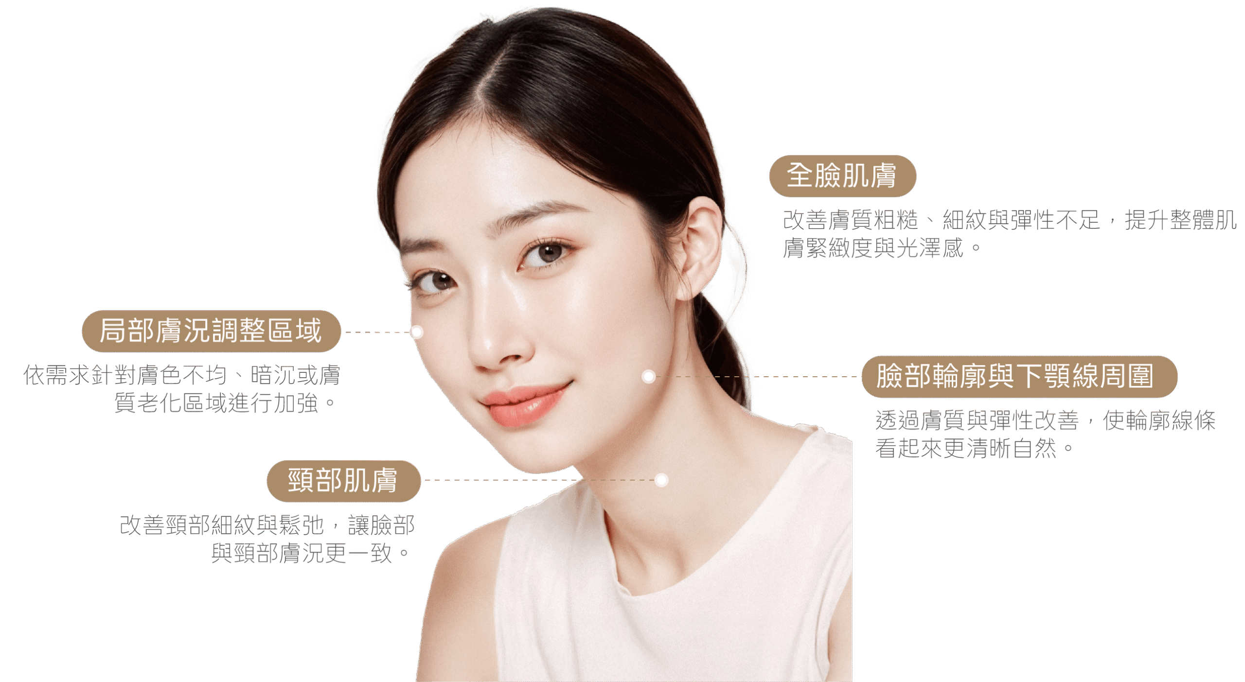 Trinity Liftoning TRINITY 拉提 超音波拉提緊緻輪廓,深層喚醒肌膚彈性 About the Treatment 什麼是 TRINITY 拉提? TRINITY 拉提是一款結合 755nm、808nm、1064nm 三種雷射波長的多波長雷射療程,透過不同波長對應不同皮膚層次的特性,同步作用於表皮層、真皮層與皮膚深層組織,達到緊膚拉提、膚質改善與整體膚況優化的效果。 Treatment Features TRINITY 拉提的特色 相較於單一波長雷射,TRINITY 拉提以「三波長同時或分段施作」的方式,依個人膚質、膚況與老化程度進行調整,使能量更精準作用於目標層次。療程過程中搭配冷卻系統,可降低表皮熱刺激,提高施作舒適度,適合希望改善鬆弛、細紋、膚色不均與膚質粗糙問題,但不想承受長恢復期的人。 三波長雷射整合,分層作用更全面 同時運用 755nm、808nm 與 1064nm 波長,分別針對表皮至真皮不同深度作用,可依皮膚狀態彈性調整,提升整體療程效果的完整度。 促進膠原蛋白新生 雷射能量可刺激真皮層膠原蛋白重組與新生,幫助改善肌膚彈性流失、細紋與初老現象,使膚況更緊緻平滑。 同步改善膚質與膚色狀態 透過不同波長對黑色素、血管與皮膚組織的作用特性,有助於改善膚色不均、暗沉與膚質粗糙問題。 冷卻系統設計,降低表皮刺激 施作過程中搭配冷卻機制,可減少雷射熱感帶來的不適,提升療程舒適度與安全性。 非侵入式雷射療程,恢復期短 全程無傷口、無需麻醉,術後僅可能出現短暫泛紅或溫熱感,多數人可於短時間內恢復日常作息。 Treatment Areas 適用施作部位 TRINITY 拉提可依不同部位的皮膚厚度、老化程度與膚況需求進行分區施作,醫師會根據個人條件調整雷射波長、能量與施作方式,使能量穩定作用於目標層次,在改善膚質的同時維持整體膚況的自然協調。療程常應用於臉部與局部肌膚保養需求,強調「整體膚況提升」而非單點治療,讓改善效果更均衡、不突兀。 全臉肌膚 改善膚質粗糙、細紋與彈性不足,提升整體肌膚緊緻度與光澤感。 臉部輪廓與下顎線周圍 透過膚質與彈性改善,使輪廓線條看起來更清晰自然。 頸部肌膚 改善頸部細紋與鬆弛,讓臉部與頸部膚況更一致。 局部膚況調整區域 依需求針對膚色不均、暗沉或膚質老化區域進行加強。 Treatment Process TRINITY拉提施作流程 STEP 01 3D 皮膚與臉部輪廓檢測 使用 3D META VU 儀器進行 360 度全臉掃描,精準分析膚質、輪廓結構與老化狀況,作為後續評估依據。 STEP 02 院長一對一諮詢 透過一對一專業諮詢,全面評估個人肌膚狀況,量身規劃療程範圍。 STEP 03 清潔並進行施作 進行卸妝與清潔,並依規劃的波長與能量參數進行雷射施作,過程中搭配冷卻系統降低熱刺激。 STEP 04 術後說明與保養建議 施作完成後說明術後照護重點與注意事項,協助修復期順利進行。 Who Is It For? 推薦施作對象 • 肌膚出現鬆弛、細紋或彈性下降者• 膚色暗沉、膚質粗糙,希望整體膚況提升者• 希望透過非侵入式方式進行肌膚保養與拉提者• 不想接受長恢復期療程的人• 想進行定期膚況管理與抗老保養者 Aftercare Guidelines 術後注意事項 1. 術後可能會出現輕微泛紅或腫脹,通常為暫時性現象。 2. 當天即可進行基本清潔與上妝,但避免過度摩擦肌膚。 3. 術後數日內避免高溫環境,如三溫暖、烤箱或過熱水溫。 4. 加強保濕與防曬,有助於穩定膚況並延續療程效果。 5. 若出現持續不適或異常反應,請立即回診由醫師進行專業評估。 6. 若發現線體外露或出現不適,請立即聯絡診所回診處理。 Possible Side Effects & Risks 副作用與風險提醒 所有療程皆因個人體質與狀況不同,可能導致效果出現差異,也有極少數機率出現副作用。建議您在療程施作前,務必與醫師進行充分且詳盡的諮詢,確認自身狀況是否適合施作,並審慎評估後再決定是否接受療程。